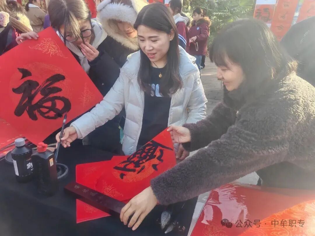 活动现场暖意融融,处处洋溢着喜庆的气息。在写春联区域,书法社团的指导老师率先挥毫泼墨,笔走龙蛇间,“龙腾华夏开锦绣,马跃神州启新程”“春归大地人间暖,福降神州喜事多”等一幅幅寓意吉祥的春联跃然纸上,笔力遒劲,墨香四溢。同学们围在一旁认真观摩,不时发出阵阵赞叹。随后,在老师的指导下,同学们纷纷拿起毛笔,凝神静气地尝试书写。尽管部分同学的笔法略显稚嫩,但每一笔都饱含着对新春的期盼。